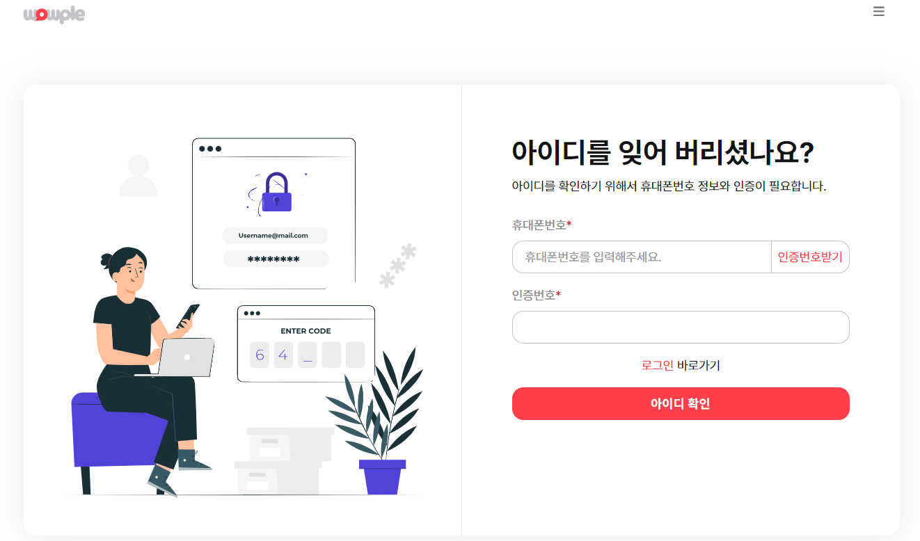 λ‘κ·ΈμΈ νλ©΄μμ "μμ΄λ μ°ΎκΈ°"λ₯Ό ν΄λ¦νμ¬ ν΄λν°λ²νΈ μΈμ¦ ν, μμ΄λλ₯Ό νμΈνμ€ μ μμ΅λλ€.