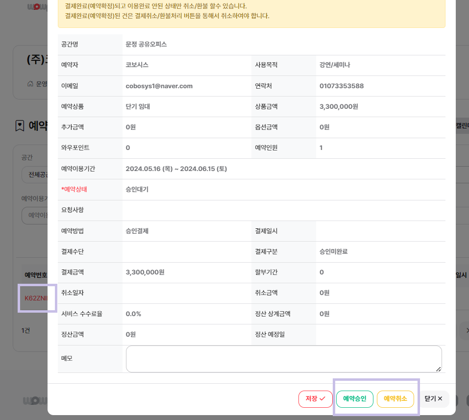 호스트 센터의 <예약현황> 메뉴에서 예약을 승인할 수 있습니다. 1. 예약상태 > 승인대기 예약을 검색해주세요. 2. 승인 대기 중인 예약번호를 클릭한 후, "예약승인" 버튼을 클릭해주세요.